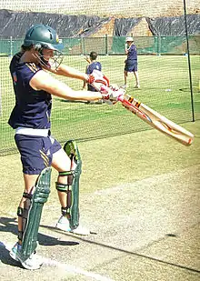 Australia stayed in England for a bilateral series against the hosts—the reigning world champions in both ODIs and T20s—after the end of the World Twenty20. Poulton scored 33 and took two catches as Australia upset England in the only T20 by 34 runs. She played in all of the five ODIs, but was not successful, being dismissed for single-digit scores every time and ending with 26 runs at 5.20.[9] She struggled to make an effective start in the matches, with a strike rate of 35.00 or less in each of her five innings and 29.54 overall.[32] England won all the matches except the last, which was ended by persistent rain. Poulton made her Test debut against England in a one-off match at New Road in Worcester. Australia batted first and Poulton came in at No. 6. She lasted only 14 balls before being bowled by paceman Katherine Brunt for 1. This was part of a batting collapse that left the tourists at 5/28, but they recovered to reach 309. Poulton then bowled four overs in the first innings, taking 0/15. She took her first catch in Tests, removing Claire Taylor from the bowling of Lauren Ebsary. Australia took a 41-run lead and Poulton then scored 23 from 41 balls before being run out as the match ended in a draw.[9][41] Poulton is the 158th woman to play Test cricket for Australia.[34]