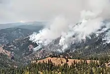 On July 25, mandatory evacuations were put in place for six homes and other structures near the fire and evacuation warnings were put in place for 250 homes on State Route 410. While the highway remained open, smoke from the fire impacted visibility.[2] Two days later, national forest roads began to be closed to public traffic and sixteen more homes, along Rock Creek were evacuated.[3][4] Smoke from the fire was visible from Cliffdell and Yakima.[4]