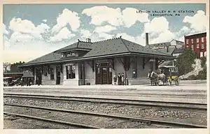 The company completed more permanent passenger and freight houses in 1863.[3] The Lehigh Valley's was one of two depots in Lehighton: the Lehigh and Susquehanna Railroad, later the Central Railroad of New Jersey, had its own depot some 600 yards (550 m) away.[4] Both were located on the west bank of the Lehigh River.[5]
