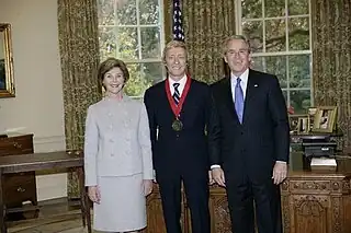 President George W. Bush and First Lady Laura Bush stand with 2005 National Humanities Medal recipient Leslie Keno on November 10, 2005 in the Oval Office.