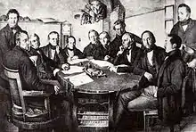 The board of directors of the Leipzig–Dresden Railway Company in 1852; from l to r: Busse (plenipotentiary), Fleischer (deputy), Haberstadt (deputy), Einert (member), Gessler (secretary to the board), Erdmann (member), Hirzel (member), Lampe (deputy), Harkort (chairman), Dufour-Feronce (member), Seyfferth (deputy), Preusser (deputy) (photo of 1852)