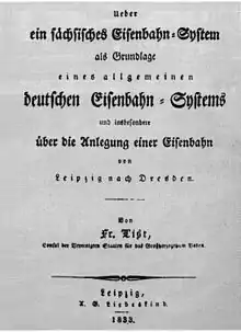 Title page of List's paper About a Saxon railway system as the basis of a general German railway system and especially about the routing of a railway from Leipzig to Dresden, Leipzig 1833