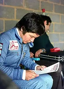 After a brief experience with karting as a child, Lombardi bought her first car in 1965, racing in Formula Monza. She moved on to Formula Three in 1968.[7] In 1974, Lombardi was signed to drive the Shellsport-Luxembourg Lola in F5000 and finished fourth.[2] Initially, Lombardi tried to qualify for Formula One with a privately entered Brabham supported by the Italian Automobile Club but failed to qualify.[8] That winter, she met an Italian nobleman, Count Vittorio Zanon, who sponsored her entrance into F1.[2] In 1975, Lombardi was invited to join Vittorio Brambilla and Hans-Joachim Stuck on the March engineering team, racing the full season with Zanon's Lavazza Coffee Company’s sponsorship.[2] At the opening race of the campaign in South Africa, Lombardi became the first woman, since Maria Teresa de Filippis in 1958, to successfully qualify for a Grand Prix. 1975 would prove to be an eventful season for the March Team, as Lombardi scored a Championship point in the Spanish Grand Prix. However, this race only lasted 23 laps until Lombardi was forced to retire with a fuel system problem. The race suffered a major tragedy when the rear wing on Rolf Stommelen's Embassy Hill broke, sending him into the barrier. While trying to avoid Stommelen as he crossed the track, Carlos Pace crashed, and five spectators were killed by Stommelen's flying car. The race continued for another four laps, resulting in Lombardi’s sixth-place finish. With the race being stopped before three-fourths of the scheduled race distance was reached, only half points were awarded.[9] Lombardi also successfully performed at other races, including the German Grand Prix at the Nürburgring, where she finished seventh. At the United States Grand Prix at Watkins Glen, Lombardi had a one-off drive for Williams. However, she was prevented from starting due to an ignition problem.