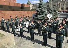 On 26 January 1924, the head of the Moscow Garrison issued an order to place the guard of honour, popularly known as the "Number One Sentry", at the mausoleum.[4] The guard of honour was disbanded following the Russian constitutional crisis of 1993, but was restored at the Tomb of the Unknown Soldier in Alexander Garden four years later.