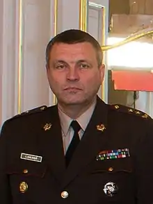 Lieutenant General Leonīds Kalniņš (born February 13, 1957, in Tomsk Oblast, RSFSR, Soviet Union) is a Latvian politician and general. He currently serves as the Commander of the Joint Headquarters. He was born in 1957 in the Russian Pervomaysky District and attended the Dobele R. Eihes Secondary School (now the Dobele State Gymnasium) in his youth. After graduating in 1975, he began his service in the Soviet Armed Forces, attending the Vilnius Higher Airborne Defense School. In 1990 he graduated from the Kharkov Military Academy in Ukraine. In 1997, he began his service in an infantry battalion in the Latvian National Armed Forces. His first official position he took was as the Chief of the Operational Planning Board of the Latvian National Guard Headquarters. In 2006, Kalniņš was appointed as deputy commander of the Latvian Contingent in Iraq. Between 2010 and 2013, he studied at the Baltic Defence College in Estonia and the United States Army Command and General Staff College in Kansas. In November 2016, he was promoted to the post of Commander of the Joint Headquarters of the NAF and was confirmed by the Saeima at the end of the year. He began his duties as NAF Commander on January 27, 2017. He is a recipient of the Order of Viesturs.[1][2][3][4][5]