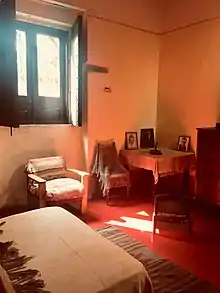 The museum consists of the house that Trotsky lived in, the garden area and the outer walls with guard facilities, located in a quiet, residential neighborhood next to an arroyo that ran parallel to the Churubusco River.[2][10] La Jornada newspaper called the atmosphere of the place “real, tense, not with abundance and not always happy.”[11] The complex was declared a historic monument in 1982.[4] The house is small and common for a dwelling built in the early 20th century in the area. One notable exception is a tower topped by a bronze eagle of the type that Venustiano Carranza used during the Mexican Revolution. It is claimed that it was a gift from Carranza to the house's former owner, a Mister Turatti. Bullet holes from the Siqueiros attack are still on the outer walls.[5] The interior of the house has been kept as it was when Trotsky lived there: the kitchen has its pots and pans, shoes are lined alongside beds, with floors and beds covered by Mexican textiles. There are some bullet holes in the interior as well. The center of the house is Trotsky's study were everything from his glasses, to papers, to books and more are left exactly as they were when Trotsky was attacked.[2][4][5]