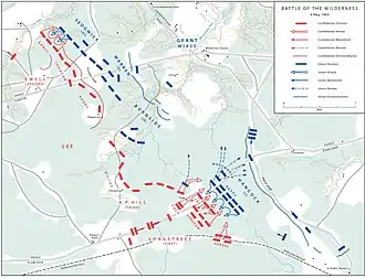 In the following days, the 57th advanced to the next engagement at Spotsylvania Court House where it was engaged from 9 to 12 May, relying on an inspired charge with fixed bayonets intended to intimidate Confederate troops. But the progress after the first few days was slow, and after several days the regiment continued its march in pursuit of Lee's army.[15]