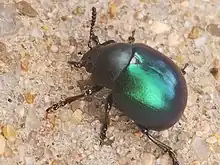 This small beetle has a black head, antennae, thorax, and legs. Its general body shape is domed and the elytra are usually deep metallic green, but sometimes metallic purple or blue.[1]