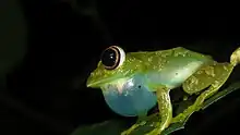 Adult L. grandiceps are slender with pointed snouts and large heads. The tympanum is distinctly small, spanning 13-25 of the horizontal diameter of the eye.[2] The toes are 12 webbed ending with large disks in both the manual and pedal digits. The inner metatarsal tubercles are small ovoid and non prominent.[2] Subarticular tubercles are somewhat prominent.[2] Their skin is a bright translucent green with light coloured patches on the frog's lower jaw.[2] They occasionally have light coloured small dots on their skin as well. Males are considered small (30-33mm) while females medium (39-45). The heads are wider than they are long and contain large protruding eyes.[2] Eyes are light coloured with orange patches and black vermiculation.[2]