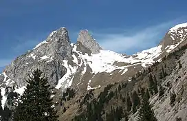 Les Jumelles (French pronunciation: [le ʒymɛl]) is a mountain in the Chablais Alps, overlooking Taney in Valais. It has two distinct summits, the highest (Grande Jumelle) being 2,215 metres high and the lowest (Petite Jumelle) being 2,182 metres high.