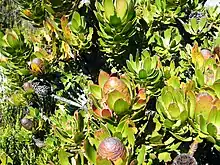 Leucadendron strobilinum, commonly called the peninsula conebush, is a plant species in the genus Leucadendron—forming part of the family Proteaceae. Confined to the Cape Peninsula, it reaches a height of up to 2.6 metres (8 ft 6 in) growing in southern, damp rocky slopes at an elevation of 500 to 1100m.[3] Its conservation status is Near Threatened—a result of inappropriate fire management, fire-break clearing and alien plant invasions.[1]