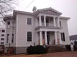 Lewis-Smith House is a historic home located at Raleigh, Wake County, North Carolina, USA It was built between 1854 and 1856, and is a two-story, three-bay, Greek Revival-style frame dwelling with a low hipped roof and Italianate-style brackets. It features a two-tier pedimented entrance portico, with paired Doric order columns at the first level and well-detailed Ionic order ones at the second. Two-story, demi-octagonal projecting bays were added to the sides in the early-20th century.[2]