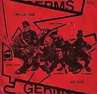 In the Germs, a man whose birth name was Paul Beahm served as singer and one of the principal songwriters. During the time of the Germs, Paul actually went by other names he made up for himself. At the time of the band's debut single, he called himself Bobby Pyn. Bobby Pyn's persona on the single was the rather innocent "Sex Boy".[4] On "Lexicon Devil," he reinvented his on-record persona as the much darker Darby Crash,[5][6][7] who sings his fascistic mission statement in the self-mythologizing "Circle One",[4][8] the guitar frenzy which opens the side B:[6][9][10][11]