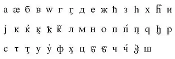 | а | б | в | г | гъ | гь | д | е | ё | ж | з | и | й | к | къ | кь | кӏ | л | м | н | о | п | пӏ | р | с | т | тӏ | у | уь | ф | х | хъ | хь | ц | цӏ | ч | чӏ | ш | щ | ъ | ы | ь | э | ю | я |
