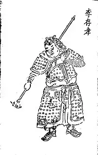 The Yuan Dynasty master playwright Guan Hanqing wrote a play titled "A Grieving Lady Deng Painfully Laments Cunxiao" (鄧夫人苦痛哭存孝), which was translated as "Death of the Winged-Tiger General" by Yang Hsien-yi and Gladys Yang in 1958.[6] (Lady Deng was the name of Li Cunxiao's wife in the play.) According to the play, Li Cunxiao was extremely loyal to Li Keyong and never intended to rebel, but was falsely accused of that by the treacherous Li Cunxin and Kang Junli, who had him cruelly executed behind Li Keyong's back. Influential Ming Dynasty novelist Luo Guanzhong's classic novel Romance of the End of Tang and Five Dynasties Histories (殘唐五代史演義) expanded on this account and exaggerated Li Cunxiao's heroic prowess. Several modern dramas were in turn based on these largely fictional stories and deviated even more from history, including: