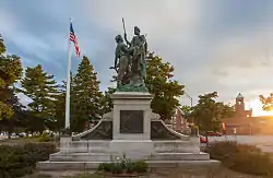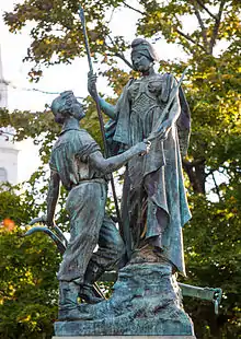 Liberty Arming the Patriot, sometimes called Freedom Arming the Patriot,[2] is a bronze sculpture at Park Place in Pawtucket, Rhode Island, commemorating the participation of the city's citizens in the American Civil War. It was designed by William Granville Hastings and cast by the Gorham Manufacturing Company in 1897. Unlike many Civil War memorials, Liberty Arming the Patriot is a dynamic composition, depicting a young farmer setting his plow aside, and reaching to take a sword from a classical female figure clad in breastplate and wielding a pike. The statue is 11 feet (3.4 m) in height, and is mounted on a granite base 10 feet (3.0 m) high and 22 feet (6.7 m) wide. The sculpture was listed on the National Register of Historic Places in 2001.