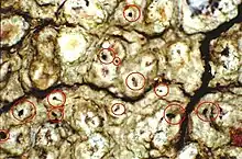 | photograph of an herbarium specimen taken through a dissecting microscope (x40) showing the black apothecia (within the red circles) of Lichenodiplis lecanorae parasitizing the apothecia of Pertusaria xanthodes | |
