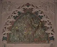 In 1344 the chapel was expanded to a Gothic hall church of three naves.[2] A document about its consecration mentions two altars. From 1415, the south facade was transformed, including a tympanum showing the Adoration of the Magi made by the workshop of Madern Gerthener.[3][4] In 1453 the town council permitted to change an adjacent tower of the fortification to a bell tower. From 1506 to 1509 the church was once more expanded, by Jörg Östereicher.[3] The church remained Catholic, part of the Diocese of Mainz, even when the Reformation was introduced in Frankfurt in 1533.[1]