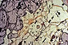 Thin section of interior hornfels of contact aureole showing garnet, cordierite, orthopyroxene in plane polarized light. Presence of orthopyroxene indicates high-grade contact metamorphism.