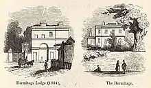 The road is named after Sir John Scott Lillie (1790-1868), who first laid out the easternmost section of the road across his North End Hermitage estate in 1826 running from Gunter's footbridge over the tidal Counter's Creek to the T junction of the old Crown Lane with North End Lane.[2] The intention was to link traffic from the new Hammersmith Bridge with the North End wharves of the planned Kensington Canal, thus obviating passage through Hammersmith and Kensington, or following the entire loop of the River Thames to Chelsea.[3] Lillie's development also included late Georgian housing, terraces called, 'Rosa Villas' and 'Hermitage Cottages', on the north side of his 'New' road, some of which remain and recall Hermitage House that once stood here. He also built a brewery on the opposite side of the road in 1832. Only its 1835 public house, 'The Lillie Arms' remains, renamed the Lillie Langtry, due to the surmise that the Jersey actress had her assignations with the future Edward VII in one of the Georgian houses in Lillie Road. The Lillie Langtry is one of the oldest extant pubs in Fulham, while the 1883 Prince of Wales, opposite, rebuilt by Watney Combe & Reid in the Arts and Crafts style in 1938, is destined for imminent demolition, unlike the former Fuller's Seven Stars, West Kensington, around the North End Road corner, also from 1938, which has been preserved as flats.[4]