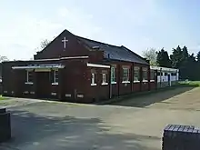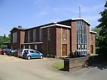 By 1959 it was already becoming clear that the existing building was too small for activities, especially the sunday school, so a new building committee was set up. Further land adjacent to the site was purchased for £200 and by 1963 plans were put in for a much larger new church. The first sod was cut for these schemes on 10 April 1965 with expected costs of £28,000. Whilst the presence of an old gravel pit initially hampered work the first service at the new church took place on 3 September 1966.[3] It contained foyer, cloakroom, toilets, main hall and vestry and was much taller than the old church. The 1954 church at that point took on the role of a church hall with the vestry being removed and the kitchen extended.