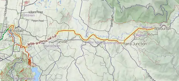 The Lilydale to Warburton Rail Trail (also known as the Warburton Trail) is a walking, cycling and horse-riding track in eastern Victoria, Australia. It runs a distance of 38 km between Lilydale and Warburton, along the former Warburton railway line. A section between Corduroy Road in Yarra Junction and Warburton is also known as the Centenary Trail.[1][2]