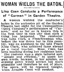 - ↑ "WOMAN WIELDS THE BATON.; Lina Coen Conducts a Performance of "Carmen" in Garden Theatre". The New York Times. 1917-02-08. p. 10. Retrieved 2020-07-14.