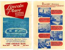 Lincoln Place Apartment Homes is a historic apartment community owned by a subsidiary of Apartment Investment and Management Co. (Aimco). Inspired by the garden city movement, it is located at 1050 Frederick Street on a 35-acre site in the Venice community of Los Angeles, one mile east of Venice Beach. Built from 1949-1951, the property is just off Lincoln Boulevard, bound by Lake Street and Penmar Avenue with Elkgrove Avenue and Elkgrove Circle within its interior.[3]