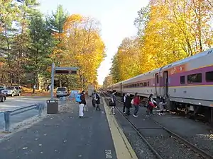Lincoln station is an MBTA Commuter Rail in Lincoln, Massachusetts, served by the Fitchburg Line. The station has two side platforms, both adjacent to the outbound track but on opposite sides of the Lincoln Road grade crossing. Outbound trains stop at the north platform, while inbound trains stop opposite the south platform and passengers use two asphalt crossings to board. The configuration was made to minimize the number of stopped trains that block Lincoln Road, as the town emergency services are based nearby and Lincoln Road is the most direct route to the town center. Both platforms are low-level; Lincoln station is not accessible.