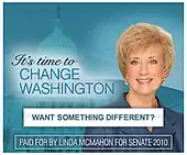 McMahon ran as an outsider, criticizing the Senate for its connection to Wall Street and federal banking bailouts. Her campaign ads emphasized her distance from politics, stressing she was "not a career politician". She criticized the current Senate for passing large bills in a perfunctory manner, particularly the $800 billion stimulus package.[10] Her first televised political ad, "Perseverance", touted her experience as a business leader, stating, "Thirty years ago, my husband and I started our business. It wasn't always easy but we grew it into a publicly traded company that's creating jobs here in Connecticut today."[11]