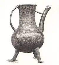 In 1790 Smith records that a bronze tripod ewer was found in Lindston Loch, measuring 9+58 inches high, by 3+14 inches across the mouth, spreading out to 4+18 inches. It has a spout and handle and is regarded being of late medieval origin; for many years it was kept at the Dalrymple Manse.[4] A bronze tripod ewer, with spout and handle, almost identical to the Lindston Loch specimen, was found at nearby Skeldon.[5] The old Roman road from the Solway Firth and the Clyde ran near here, passing from Causeway Farm onto Perclewan and Lindston. The above mentioned ewer was found near this road;[6] a glazed pitcher of earthenware was found at Perclewan near the old road in 1833, bearing the figure of a man's face and hands on the front.[6]