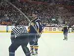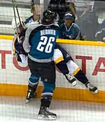 Steve Bernier, shown here playing for the San Jose Sharks, was acquired by the Sabres in 2008 in a trade which sent Brian Campbell to San Jose.[5]