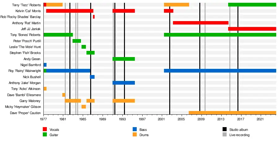Discharge are an English hardcore punk band from Stoke-on-Trent. Formed in early 1977, the group originally featured a lineup of vocalist Terry "Tezz" Roberts, guitarists Roy "Rainy" Wainwright and Tony "Bones" Roberts, bassist Nigel Bamford and drummer Tony "Acko" Atkinson. The band's current lineup features Rainy on bass (a constant member, save for the group's 1991–99 reunion), Bones on guitar (who originally left in 1982 and rejoined in 2001), Tezz on guitar (the band's drummer from 1977 to 1980 and 2001 to 2006, before rejoining in 2014), drummer Dave "Proper Caution" Bridgwood (since 2006) and vocalist Jeff "JJ" Janiak (since 2014).