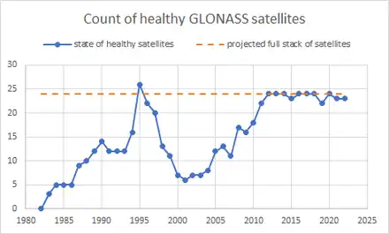 - ↑ "По сообщению Центра управления системой ГЛОНАСС 10.11.2022г. c 12:15 (МСК) прекращены все работы с КА Глонасс-М №735 (22-ая рабочая точка), КА выведен из состава орбитальной группировки ГЛОНАСС". glonass-iac.ru. Retrieved 6 April 2023.