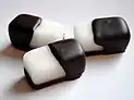 Pieces of peppermint fondant, half covered in dark chocolate, about the size of two sugar cubes side by side. |