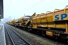 Plasser & Theurer MFS-100 material conveyor and hopper unit for continuous loading and unloading, operated by Spitzke Logistik GmbH.