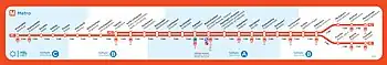 The system contains a single forked line with 30 stations along a total length of 43 kilometres (27 mi), running from southern Espoo via central Helsinki to the East Helsinki suburbs.[4] 21 of the stations are located in tunnels, including every station west of Sörnäinen as well as Puotila and Itäkeskus.[5] Every other station is on the surface or elevated. The Länsimetro extension continues the line into western Helsinki and the neighbouring municipality of Espoo.[5] The system has two depots, located in Roihupelto, Helsinki and Sammalvuori, Espoo.[5][6]