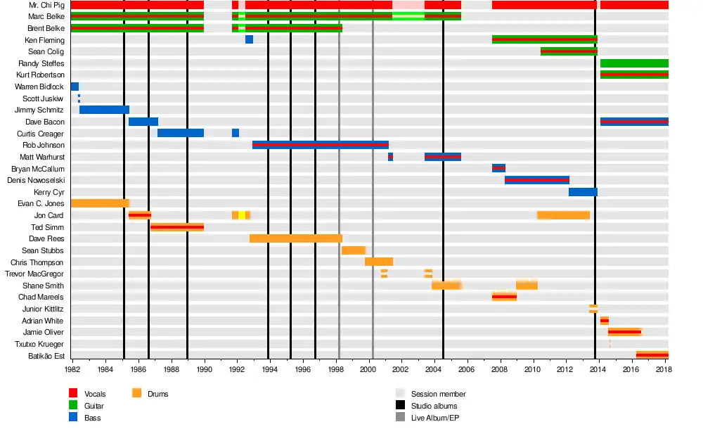 After Chinn, founding guitarists Marc and Brent Belke served the longest tenures, at 22 and 15 years respectively (discounting the band's inactive time). Bassist Rob Johnson played with the group for nine years, while Fleming and bassist Dave Bacon each spread two stints in the group over nearly eight years. The longest-standing consistent lineup lasted from late 1992 to early 1998 and featured Chinn, both Belkes, Johnson, and drummer Dave Rees.