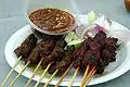 Satay Meat dish Dish of seasoned, skewered and grilled meat, served with a sauce.