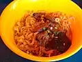 Mee goreng Noodle dish Thin yellow noodles fried in cooking oil with garlic, onion or shallots, fried prawn, chicken, pork, beef, or sliced bakso (meatballs), chili, Chinese cabbage, cabbages, tomatoes, egg, and other vegetables.