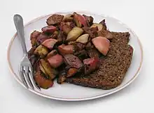 Denmark | Æbleflæsk is a traditional dish in Danish cuisine. The dish made of bacon, onions, apples, and sugar served on rugbrød.[4] |