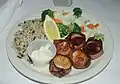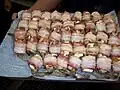 Bacon-wrapped shrimp are shrimps which have the tails removed and are wrapped in bacon.[24] | |