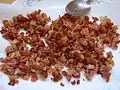 Real bacon bits are made from bacon that has been cooked, then dried, then crushed into small pieces.[11] Imitation bacon bits are fashioned from textured vegetable protein.[12][13] Bacon bits are commonly used as a topping or garnish, and they can be incorporated into foods as an ingredient.[11] | |