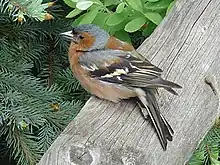 Finches are seed-eating passerine birds, that are small to moderately large and have a strong beak, usually conical and in some species very large. All have twelve tail feathers and nine primaries. These birds have a bouncing flight with alternating bouts of flapping and gliding on closed wings, and most sing well.