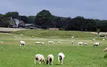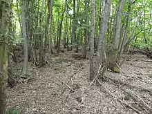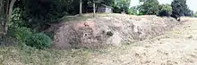 This Norman castle was intended both to protecting the local villages and probably intended to operate with the castles at Glasshouse Woods and Howle Hill Camp as a screen to protect the city of Gloucester from military threats from Wales.[31] The castle itself is circular and relatively small, some 60 ft in diameter, with an inner and an outer bailey, the latter protected by a very tall vallum wall.[45] The outer wall was originally 15 ft tall.[46] Uniquely for a castle of this period the outer wall has a motte integrated into the design, rather than located at the centre of the castle.[44] Littledean castle was only occupied briefly.[44]