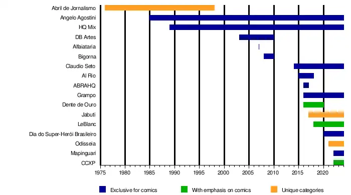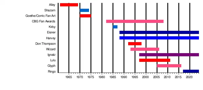 The following is a timeline of notable U.S. comics awards that feature multiple categories. Awards voted on by professionals are in shades of blue; fan awards are in shades of red. (The Ignatz Award is a mixture, as the nominees are selected by professionals, but the winners are determined by the attendees of that year's Small Press Expo.)