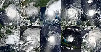 A collage of the top ten costliest Atlantic hurricanes, up to 2023, in descending cost from top left to lower right.