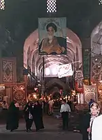 Following the Iranian Revolution, a cult of personality developed around Supreme Leaders Ruhollah Khomeini and Ali Khamenei.[64][65] This is most evident in the ubiquitous visual depictions of both men.[66] According to Baqer Moin, as part of Khomeini's personality cult, he "had been transformed into a semi-divine figure. He was no longer a grand ayatollah and deputy of the Imam, one who represents the Hidden Imam, but simply 'The Imam'."[67] Khomeini's personality cult fills a central position in foreign- and domestically targeted Iranian publications.[68] The methods used to create his personality cult have been compared to those used by such figures as Joseph Stalin, Mao Zedong and Fidel Castro, and it was encouraged by Khomeini himself (which was negatively noted by his enemies inside Iran).[69][70][71] Regarding Khamenei, Amir Taheri has written, "Like Khomeini before him, Khamenei is the object of a massive cult of personality. Official flatterers describe him as a "Divine Gift to Mankind" or as the "Shining Sun of the Imamate." In official discourse, he is quoted more often than either Prophet Muhammad or the Koran itself. Objects which he has touched during provincial visits are collected and sold as icons..."[72]