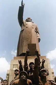 The long time ruler of Communist Albania, Enver Hoxha, had what the OECD called "an overwhelming cult of personality and an ultra-centralized, authoritarian form of decision-making".[4] Hoxha was widely portrayed as a genius who commented on virtually all facets of life from culture to economics to military matters. Statues of him were erected in cities. Textbooks were required to include quotations of his about their particular subjects. The ruling party of the time, the Party of Labour of Albania, granted him honorific titles such as Supreme Comrade, Sole Force and Great Teacher.[5] When Hoxha died in 1985, Ramiz Alia took power. Robert D. McFadden of The New York Times wrote that Alia's policies of liberalization were "too little, too late", and the country descended into civil war. Alia served one year in prison for corruption, but the anarchy prevented further charges from being filed against the former Communist regime.[6]