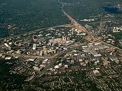 Aerial view of the South Coast Plaza–John Wayne Airport edge city: Irvine Business Complex (top), John Wayne Airport runway (upper center), South Coast Metro buildings (lower center) and below, the South Coast Plaza mall